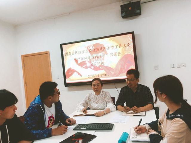 3  29 日下午团委召开团学骨干会议,传达我校 2018 年全面从严治党工作大会暨“作风建设启动年”部署会会议精神,会议由团委书记王猛主持。