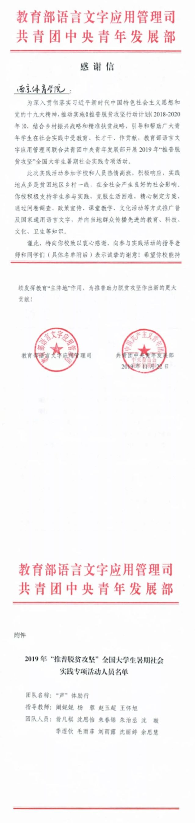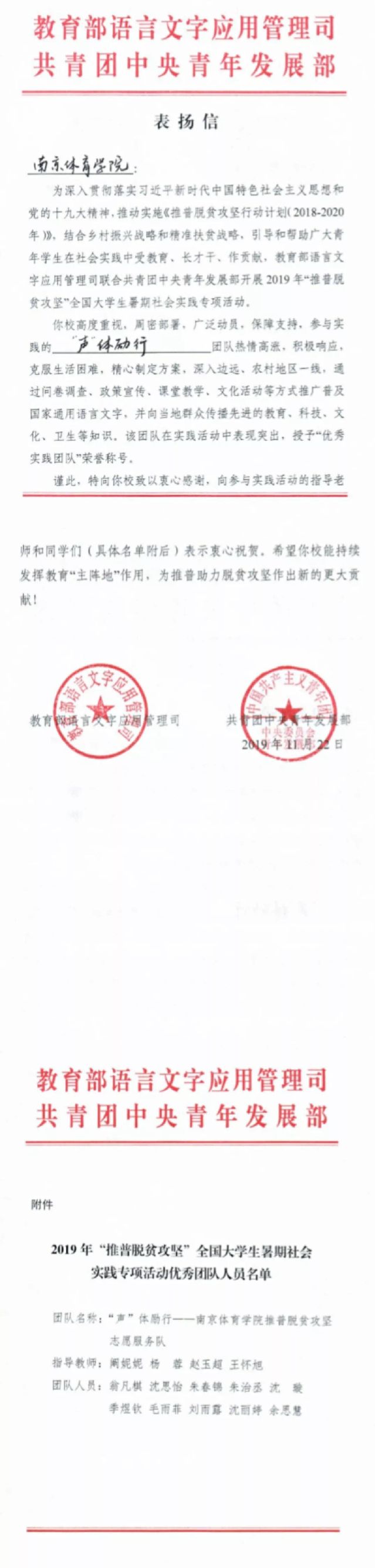 近日教育部和团中央向我校发来表扬信和感谢信,对我校团委、马克思主义学院、教务处阚妮妮、杨蓉、赵玉超、王怀旭四位老师及10名同学给予高度表扬。在今年暑期社会实践中,他们奔赴西部偏远地区推普脱贫,深受当地百姓的好评,产生了积极的社会影响力。全国高校共有200余支队伍申报成功,这是我校有史以来第一次获得双项计划,同时从众多优秀团队中脱颖而出,成为全国70支优秀团队中一员,并获表扬信!
