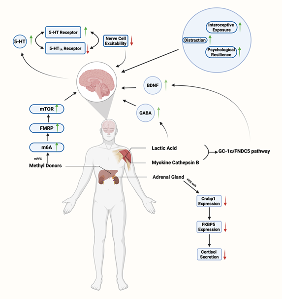 • m6A调控:慢性应激会导致mPFC中m6A水平下降,并伴随去甲基化酶ALKBH5上调,从而损伤突触可塑性。规律运动通过促进肝脏合成甲基供体,抑制ALKBH5表达,使m6A水平恢复,促进神经元正常功能。