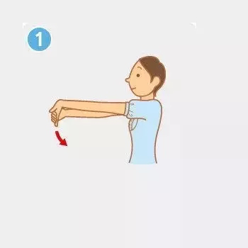 ①坐在椅子上,掌心向上,手臂向前直伸。用右手轻握左手拇指以外的四根手指,用力把手向下掰。左右手交替做上述动作。