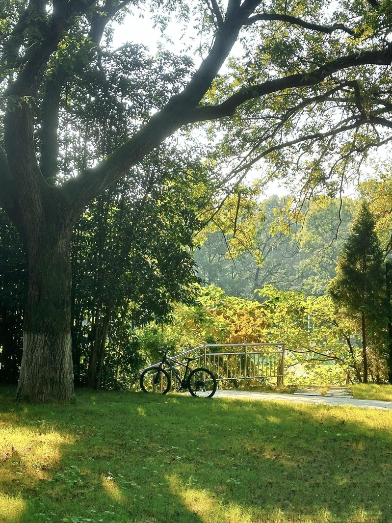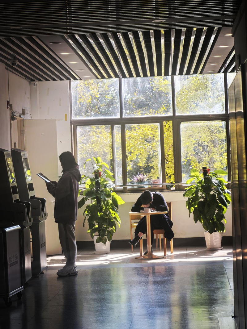 作品《图书馆一隅》:本作品摄于学校图书馆。作品展示了图书馆自然、人文、科技之美浑然天成的图景。午休时间,学生趁机借助自动借阅机借阅图书,而图书馆的工作人员则利用这片刻时间伏案小憩,周围是她悉心培养的绿植。窗外的银杏在阳光照耀下闪烁着金色的光芒,给每一株绿植都添了一丝金黄。斑驳光影,岁月静好。