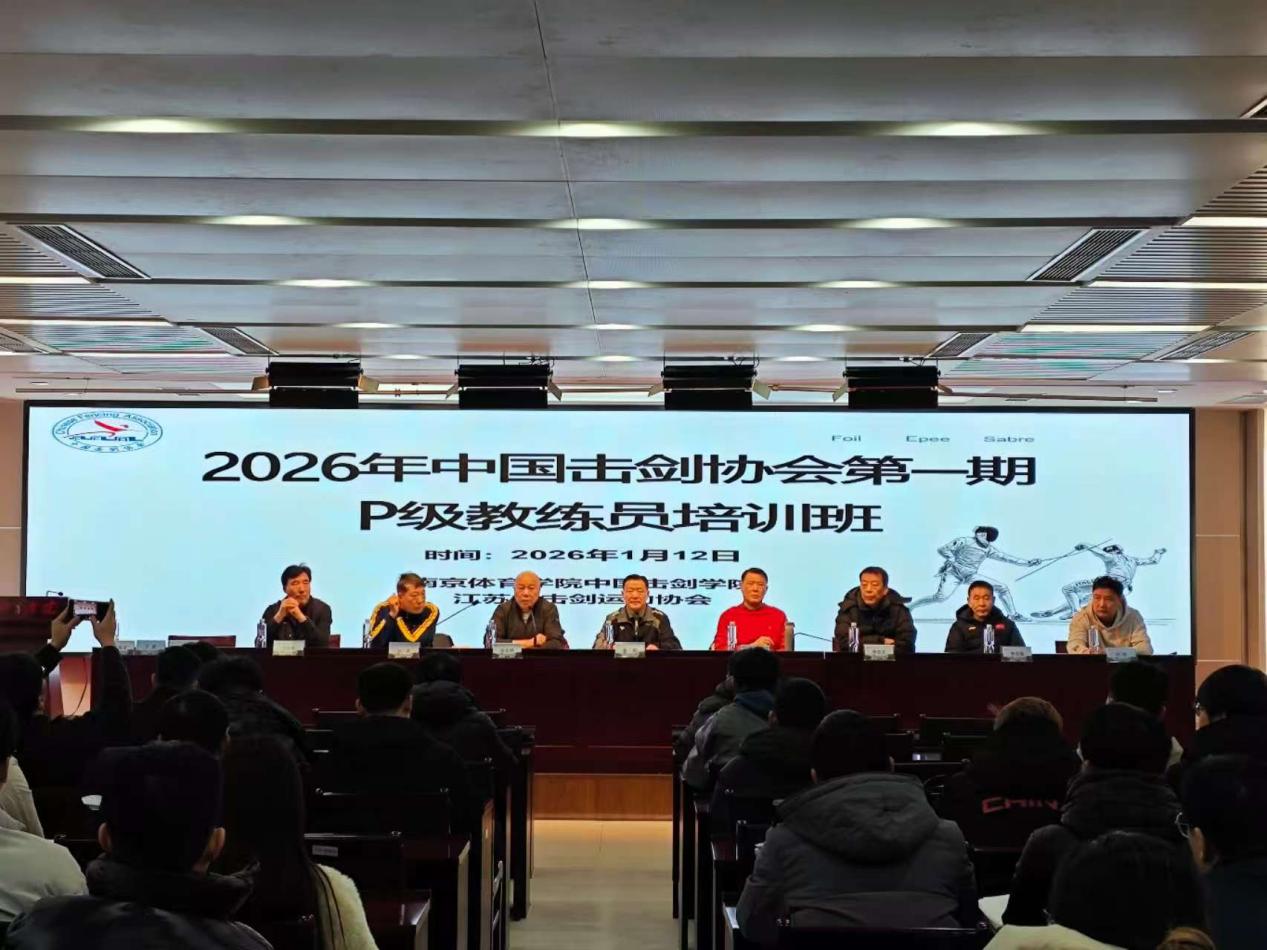 1月12日,由中国击剑协会主办、中国击剑学院承办的2026年中国击剑协会第一期P级教练员培训班,在南京体育学院办公楼举行开班仪式。原南京体育学院党委常委、副校长,中国击剑学院执行院长金松出席仪式并讲话,中国击剑协会教练员讲师团队共同出席了此次仪式。