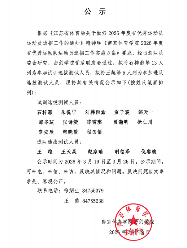 击剑学院拟报参加2026年度运动员选招进队、试训选拔测试运动员名单公示