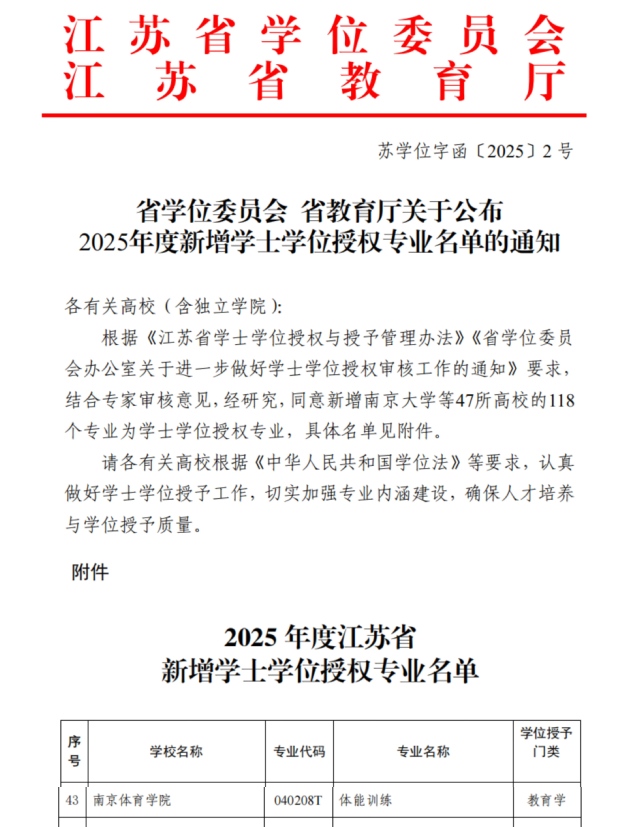 4月21日,江苏省教育厅发布《省学位委员会 省教育厅关于公布2025年度新增学士学位授权专业名单的通知》,我校体能训练专业(040208T)顺利通过学士学位授权审核,新增1个学士学位授权专业。体能训练专业是省内高校在该领域获批学士学位授权的首家专业,标志着江苏省体能训练本科人才培养迈入新阶段。
