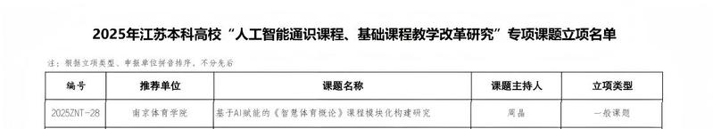 近日,江苏省高等教育学会先后发布《关于公布2025年江苏本科高校“人工智能通识课程、基础课程教学改革研究”专项课题评选结果的通知》(苏高教会〔2025〕29号)、《关于公布2025年江苏省高校“高质量公共课教学改革研究”专项课题评选结果的通知》(苏高教会〔2025〕43号),我校周晶老师主持的“基于AI赋能的《智慧体育概论》课程模块化构建研究”和李甜甜、葛见珠主持的“体教融合视域下运动员本科生劳动价值观培育研究”获批立项。