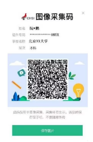 2.各学院要通知学生提前登录学信网,进入“学信档案-高等教育信息-学籍-查看图像采集码”页面,获取由学信网为每个学生提供的专属加密的二维码(简称采集码,见图1),采集码中包含学生唯一编号、姓名、证件号码等毕业生图像采集所需的必要信息,其中姓名和证件号码进行脱敏处理。学生在登录“江苏图采”小程序时,小程序会对采集码进行识别解密,将合格的电子图像和采集码中的信息通过安全通道传输到学信网,精准链接到学生的学籍注册信息。
