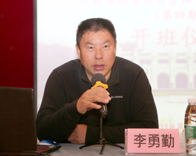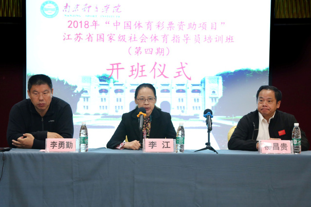 2018年“中国体育彩票资助项目”江苏省国家级社会体育指导员培训(第四期)开班仪式在海陵会议中心举行,出席开班仪式的领导有:南京体育学院副校长李江教授,省体育局群体处副调研员柳昌贵先生,南京体育学院继续教育部、培训中心主任李勇勤教授。开班仪式由李勇勤主持。