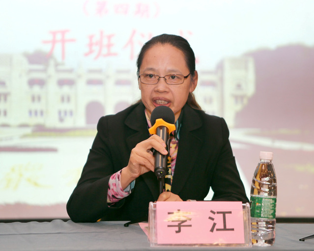开班仪式上,李江校长代表南京体育学院对来参训的各位学员及省体育局的领导表示热烈欢迎,感谢体育局领导长期以来对社会体育指导员培训的关心支持和帮助,也感谢在座的各位学员放弃休息时间在百忙之中来参加培训。李江校长向参训学员介绍了南京体育学院的现有教学条件和师资力量,及“三位一体”的办学模式,为国家及全省培养优秀的运动员精英和各类体育人才;南京体育学院自2011年被批准为国家级社会体育指导员培训基地至今,已经承办了30多期培训班,并已培训3000多人我。最后她预祝本期培训班取得圆满成功,祝各位学员在培训期间身体健康、学习顺利、生活愉快。