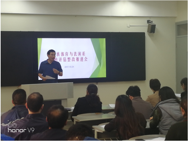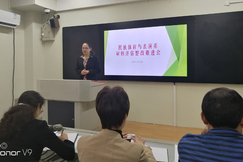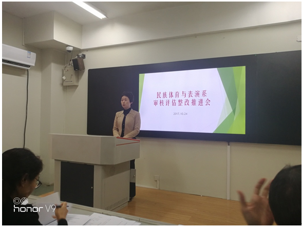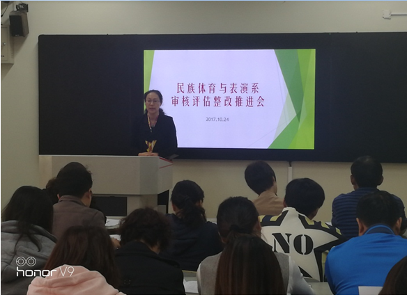 10月24日中午,副校长、审核评估工作指挥部副总指挥李江出席民族体育与表演系审核评估工作整改推进会,现场督查与指导民表系审核评估整改工作并讲话。她高度评价了民表系前期评估准备工作,总结并肯定了民表系审核评估冲刺阶段工作思路和安排,并就下一步工作提出三点意见:一是进一步加强学习,强化对整个评估工作和专业特色的了解与认识;二是明确责任,责任到人,全体人员要以主人翁的意识把评估当做一项事业来做;三是狠抓落实,补软肋,补短板。李江副校长的讲话使与会人员对评估的重要性和意义有了更清楚的认识,为下阶段评估工作指明了方向。