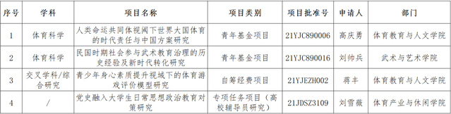近日,教育部公布了2021年度教育部人文社会科学研究一般项目立项结果,我校共有4个项目获批立项,其中青年基金项目2项、专项任务项目(高校辅导员研究)1项、自筹经费项目1项。在全国体育院校中,我校立项数仅次于成都体育学院和上海体育学院,位列第三位,创我校在此项目上历史最好成绩。