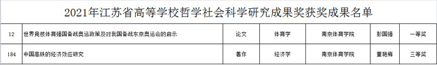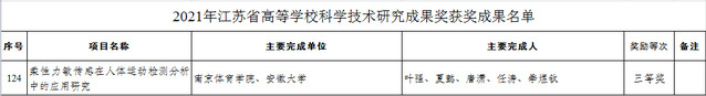 日前,省教育厅公布了2021年江苏省高等学校科学研究成果奖的获奖名单,我校彭国强老师的论文《世界竞技体育强国备战奥运政策及对我国备战东京奥运会的启示》荣获高校哲学社会科学研究类一等奖。这是全省体育学学科唯一的一等奖,同时也实现了我校哲学社会科学领域的重大突破。此外,我校董艳梅老师的著作《中国高铁的经济效应研究》荣获高校哲学社会科学研究类三等奖,叶强老师团队的成果《柔性力敏传感在人体运动检测分析中的应用研究》荣获高校科学技术研究类三等奖。