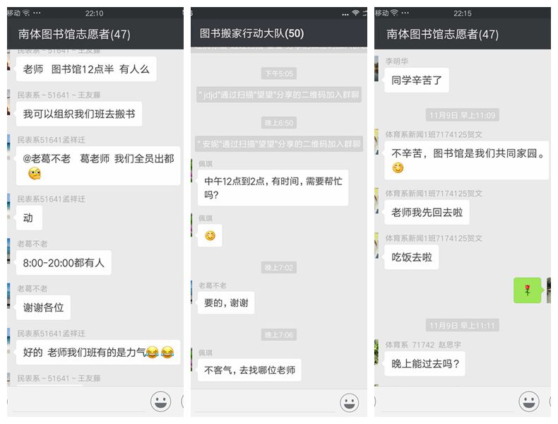 当同学们得知图书馆正面临图书上架人员不足、任务重、时间短的难题时,一批批学生志愿者积极报名加入图书上架工作。在这里,学生志愿者们同图书馆员们一起融入到了紧张而又繁重工作中,大家不叫苦,不叫累。很多志愿者还放弃休息时间, 主动要求加班干活。