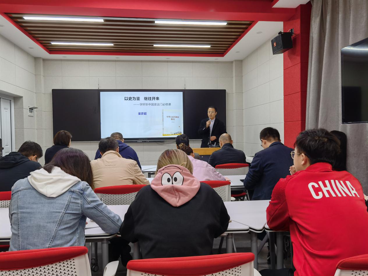 渠彦超老师用了近一个小时时间提纲挈领地讲解了“以史为鉴、继往开来——学好新中国史这门必修课”。讲座第一部分介绍了“准确把握新中国史的主线、本质”,提出新中国史的主线是“不懈奋斗”、本质是“取得伟大成就”。第二部分介绍“全面认识改革开放前后两个历史时期及其关系”,提出两个历史时期互相承接、互为因果,不可分割,不可否定;第三部分介绍“科学评价新中国史上的重大事件”,新中国成立 70 多年来,能否对抗美援朝、土地改革、“三反”、“五反”、社会主义改造、“大跃进运动、人民公社化运动”等重大事件做出客观科学的评价,直接影响到我们对新中国史的理解;我们党员同志切不可揪住某件历史事件不放,而应该全面地、历史地、发展地看待并分析新中国史。第四部分是“掌握学习新中国史的科学方法”,提醒大家须坚持以马克思主义历史观为指导、坚持“论从史出”的严谨学风、注重总结历史提供的宝贵经验。渠彦超老师的讲座逻辑清楚、重点突出、史料翔实、论证严谨,不但让直属单位党员们认识了学习重点,还学会了科学的党史学习方法,更深刻领悟了中国共产党诞生、成长、壮大的必然性与规律性,让我们进一步增强了四个意识,坚定了四个自信,始终坚持做到两个维护,更加认识到党史学习教育的重要意义。