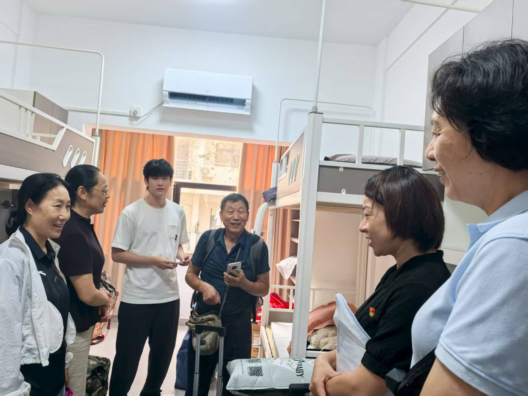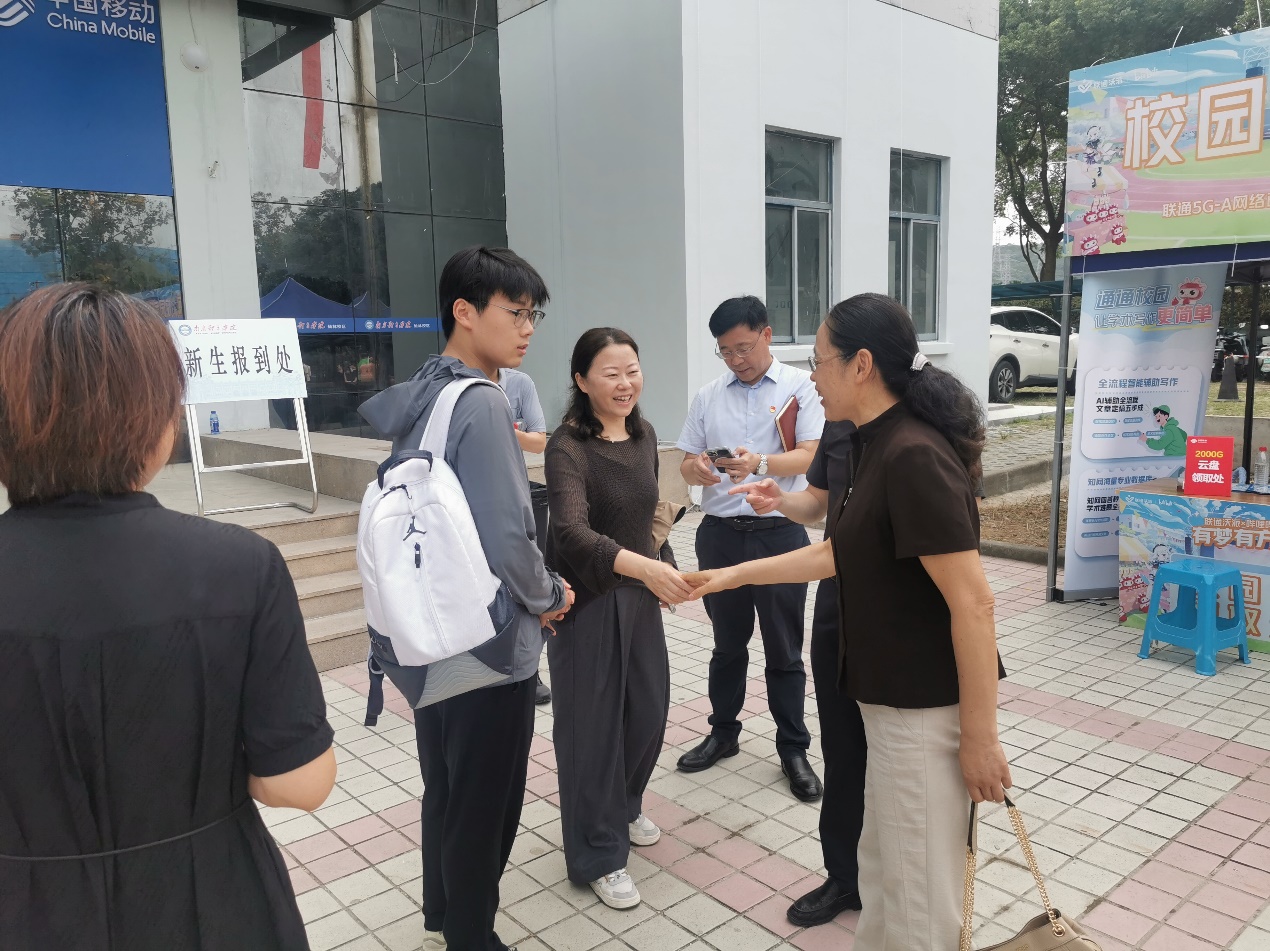 参与新生入学教育,是校关工委开展暖心关怀活动的重要举措。9月8日,我校迎来了2025级新生报到日,校园里彩旗飘扬、人声鼎沸,处处洋溢着热烈欢快的迎新氛围。在校关工委执行副主任李江率领下,关工委秘书处与常驻“五老”人员首先来到灵谷寺校区迎新报到现场,与二级学院领导进行深入交流,详细了解各学院招生情况和新生报到情况。在仙林校区新生宿舍,校关工委一行与学生交流,解答他们在学业、生活等方面的问题;悉心解答新生们的问题,帮助他们更好地规划未来;珍惜时光,提醒学生防诈防骗,主动参加社会实践锻炼自己,努力学习理论知识与运动技能,不辜负家长和学校的期望。参加过老山战役的新生家长赵先生感慨道:“我家两个小孩,今大孩儿第一次离开家到这么远的地方上学,本来还有些挺担心,看到新生宿舍全新的床位桌椅,学院领导和老师都这么热心,我做家长就放心了,将来也让老二报考南体”。