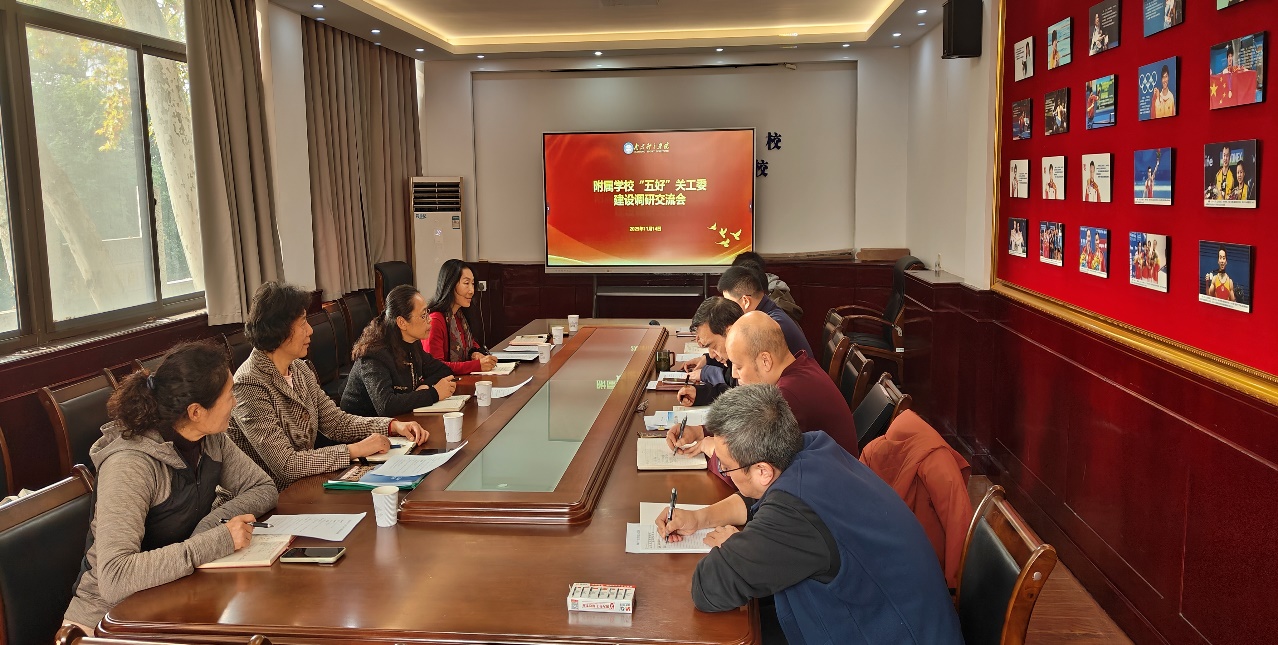 11月14日上午,附属学校“五好”关工委建设调研交流会顺利召开。校关工委执行副主任李江、秘书长刘桂彩、副秘书长陈荣梅,网球学院关工委执行副主任尤维娜,校关工委秘书杨诚组成的调研组莅临附属学校指导工作。附属学校校长、关工委主任宋虎,执行副主任吴建华,副校长、关工委副主任杨勇,成员张波,优秀青年教师代表苏舒、诸自立参会。会议由宋虎主持。