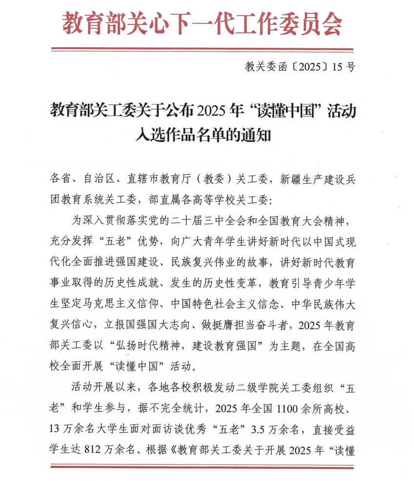读懂中国”是教育部关工委打造的高校思想政治教育品牌活动,2025年以“弘扬时代精神,建设教育强国”为主题的“读懂中国”活动开展以来,校党委高度重视,统筹谋划,将“读懂中国”与各类教育活动深度融合,校关工委协同各二级学院关工委积极组织学生、运动员与“五老”面对面深入交流,通过访谈、撰写、创作、表演和拍摄等形式,全面发动各二级学院关工委挖掘典型、申报项目,同时将活动作为基层“五好”关工委建设和品牌创建的重要举措,成为学生、运动员思想政治工作的有效抓手,引导广大青年在活动中受教育、长才干、强信念。