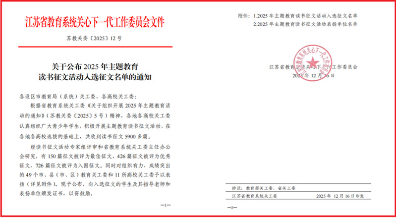 近日,江苏省教育系统关心下一代工作委员会公布了2025年主题教育读书征文活动入选征文名单(苏教关委〔2025〕12号),我校关工委选送的参选作品获得优秀征文1篇、入围征文4篇。