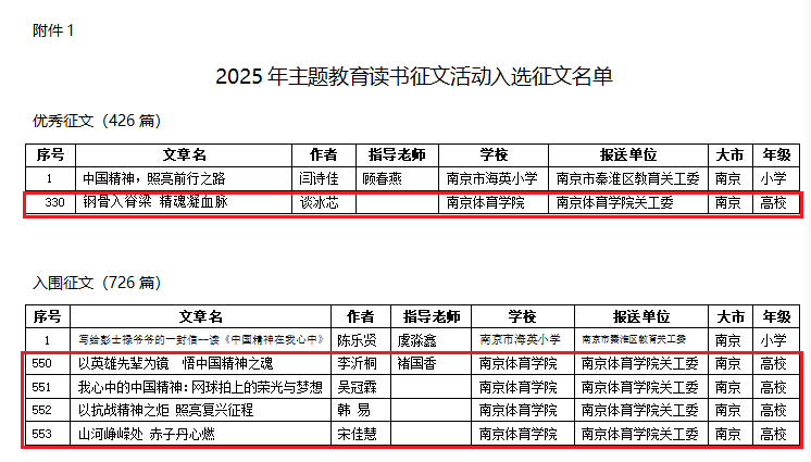 为纪念中国人民抗日战争暨世界反法西斯战争胜利80周年,弘扬伟大抗战精神,2025年省教育系统关工委组织开展了以“中国精神”和“抗战精神”为主题的读书征文活动。我校关工委积极响应,广泛动员,各二级学院关工委认真组织学生与运动员阅读指定书目并撰写读书征文。全校共收到读书征文90篇,经专家评审,遴选22篇优秀作品参加省教育系统关工委活动参评。体育教育与人文学院关工委谈冰芯同学的《钢骨入脊梁 精魂凝血脉》获优秀征文,李沂桐同学的《以英雄先辈为镜 悟中国精神之魂》(指导老师:褚国香)、宋佳慧同学的《山河峥嵘处 赤子丹心燃》、网球学院关工委吴冠霖运动员的《我心中的中国精神:网球拍上的荣光与梦想》、武术与艺术学院关工委韩易《以抗战精神之炬 照亮复兴征程》获入围征文。