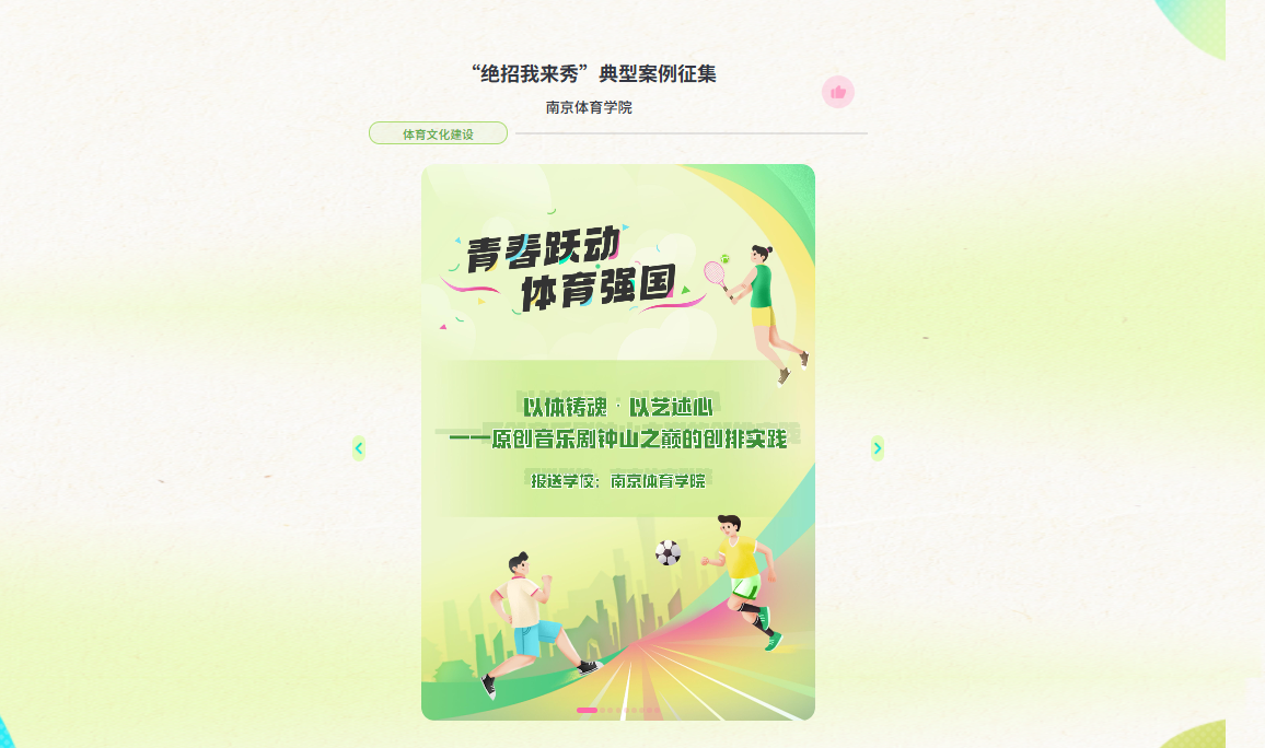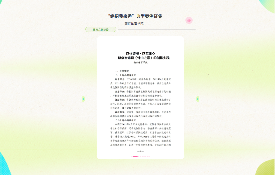 为贯彻落实全国教育大会精神和《教育强国建设规划纲要(2024—2035 年)》,推动学生体质强健计划实施,展现高校体育工作成效,由教育部体育卫生与艺术教育司指导,教育部宣传教育中心主办,北京体育大学、中国地质大学(北京)、“人民网+”承办,以“青春跃动,体育强国”为主题的高校体育风采视频和典型案例征集展示活动于今年4月举行。经过省教育部门及教育部宣传教育中心等层层筛选审核,我院提交的“以体铸魂·以艺述心——原创音乐剧《钟山之巅》的创排实践”成功进入前5%排名,于今年9月成功入选体育文化建设典型案例,在人民网客户端精彩亮相。