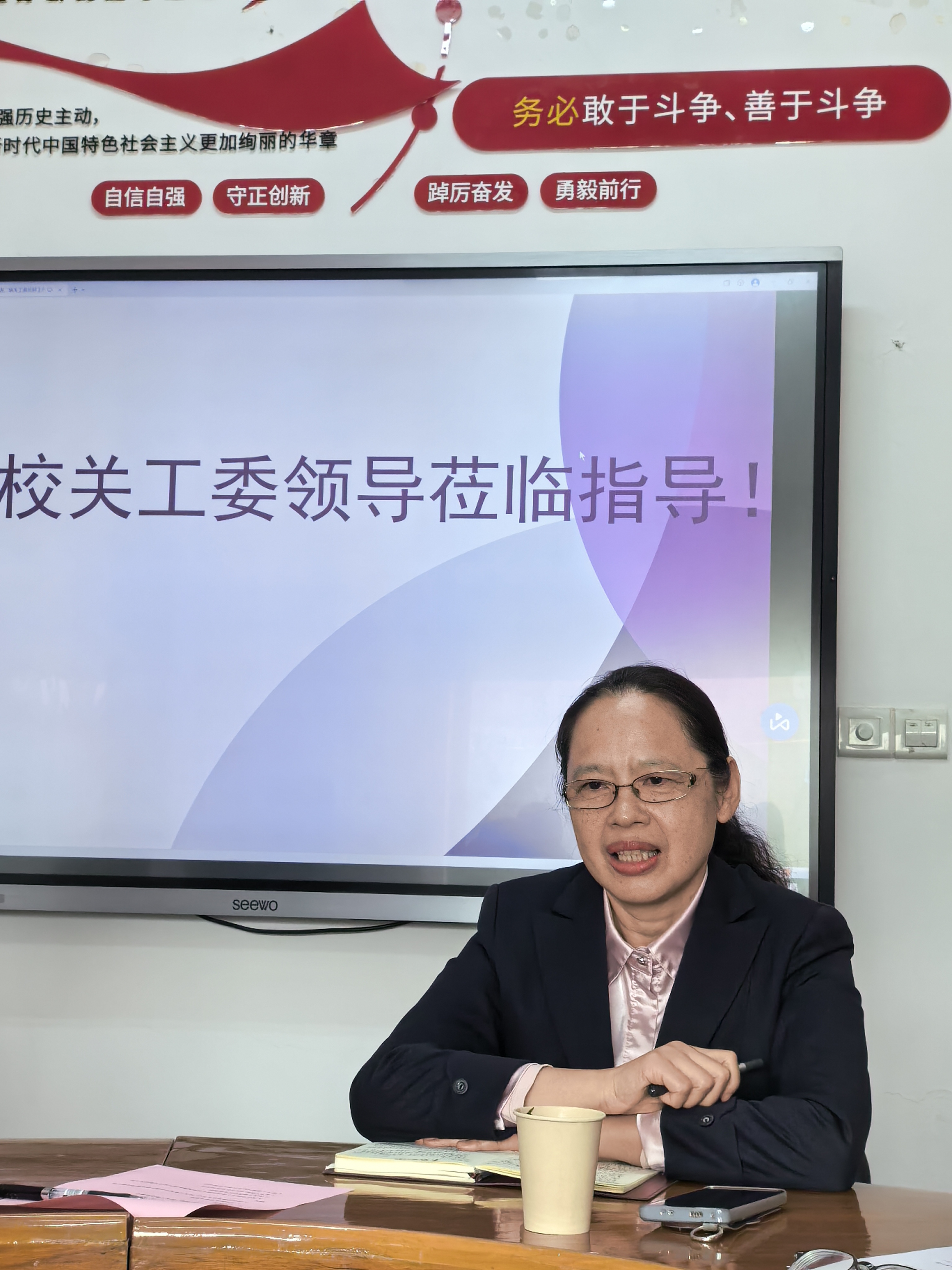 陈荣梅围绕“加强领导,确保关工委工作有人管;五老作为,确保关工委工作有人干;搭建平台,确保关工委工作有特色;积极探索,确保关工委工作有创新;联合行动,确保关工委工作有实效”五个方面,汇报了关工委工作的开展情况。重点介绍了学院依托专业优势、挖掘“南体故事”、创编艺术作品等特色工作的经验与成果,并客观分析了当前存在的不足与改进方向。