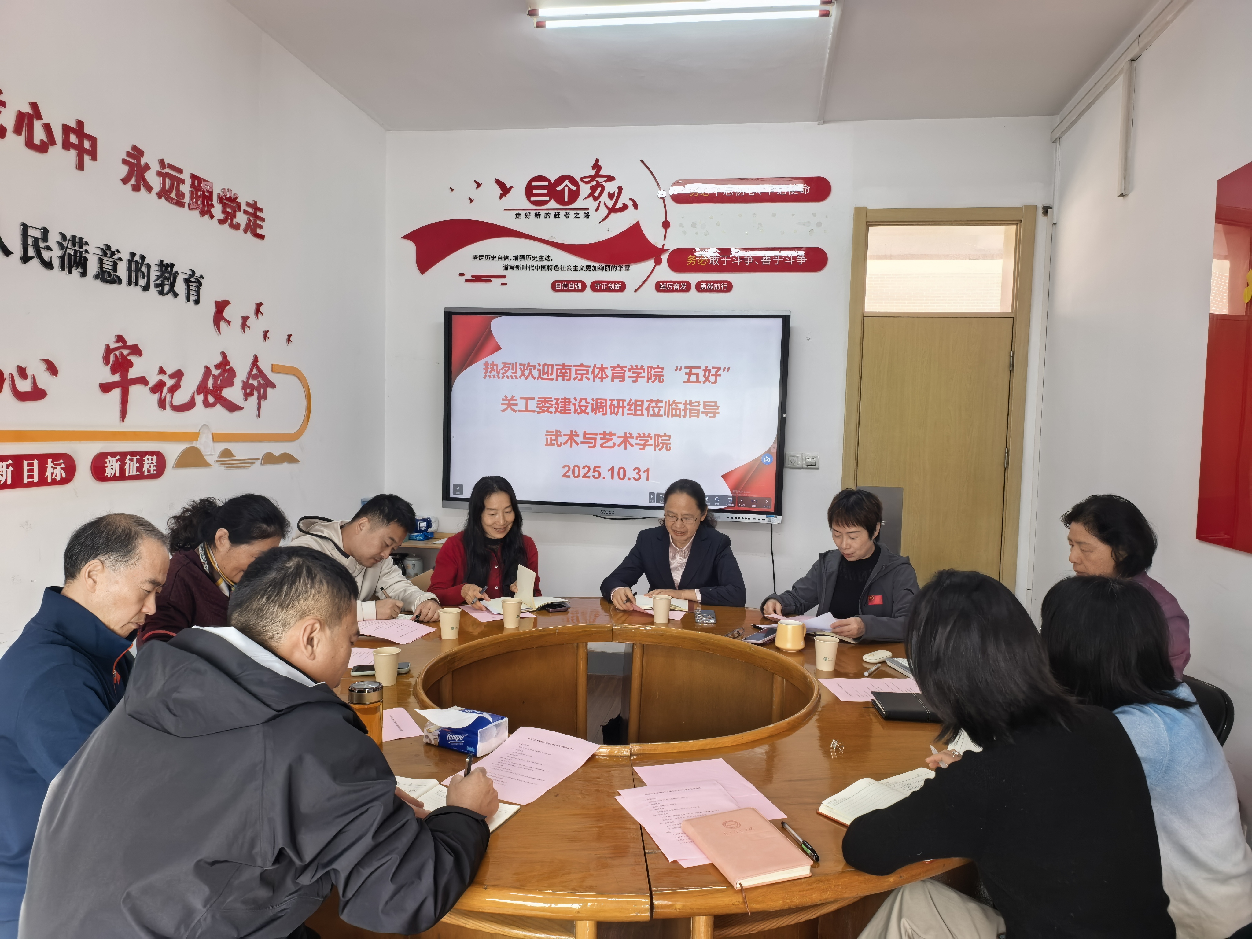 10月31日上午,武术与艺术学院关工委在教学实验楼2号楼308会议室召开工作汇报与调研交流会。校关工委执行副主任李江,离退休工作处处长、校关工委秘书长刘桂彩,网球学院关工委执行副主任尤维娜,校关工委杨诚组成的调研组莅临武术与艺术学院指导工作。武术与艺术学院党总支书记、关工委主任叶瑛,院长、关工委主任张明,关工委执行副主任陈荣梅,党总支副书记、关工委副主任杜家俊及学院关工委委员参加会议。会议由叶瑛主持。
