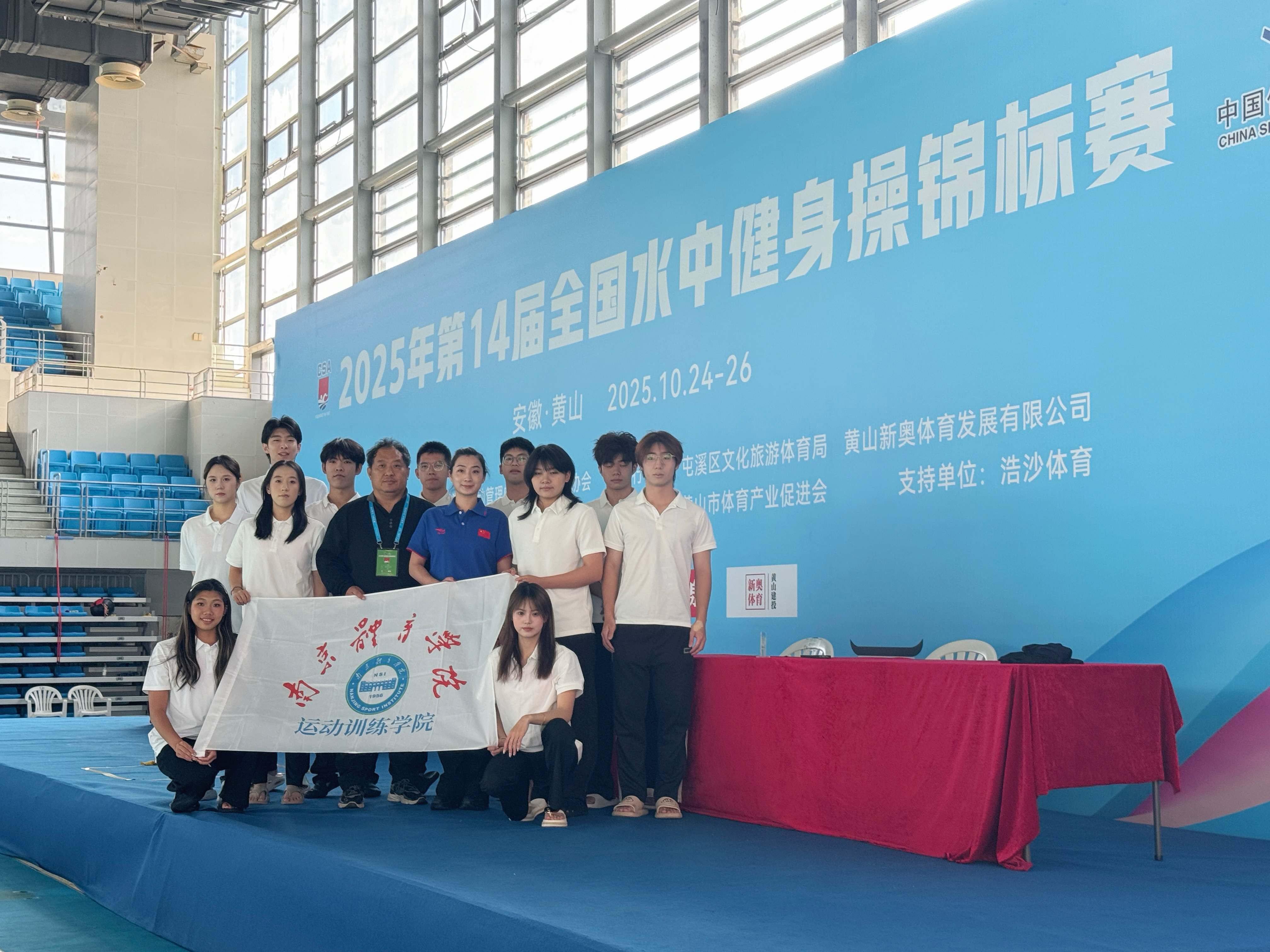 2025年 10月24日上午,为期三天的2025年第14届全国水中健身操锦标赛在黄山市游泳馆正式开幕。本次赛事由国家体育总局游泳运动管理中心、中国游泳协会共同主办,黄山市体育局与屯溪区人民政府联合承办,共吸引全国15支参赛队伍的近300名运动员、教练员齐聚黄山,参赛规模居近年前列。南京体育学院运动训练学院代表队由运动训练学院游泳专项教师马劼、周晓军和陆青老师带队,运动训练学院的11名游泳专项学生组成,在比赛中共取得了4金的好成绩,