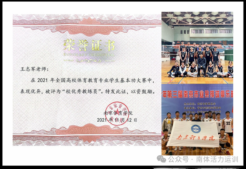 当下,他担任江苏省体育职业技能人才发展协会委员、江苏省考试院体育高考(排球专项)组长,同时还是国家职业资格(游泳救生员)培训师、考评员以及国家社会体育指导员(游泳)培训师、考评员。他秉持 “因材施教、继承发展、学以致用、服务社会” 的教育信条,始终坚守在教育一线。