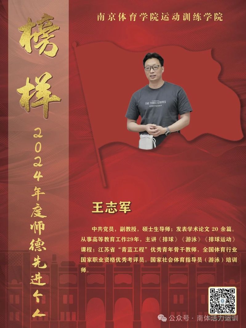 近 30 年的教育生涯里,王志军老师精心指导了数百名本科生与研究生,为社会培育出多名优秀体育教育人才。在教学期间,他还担任过 2 届班主任工作。不仅如此,他曾任运动训练学院体能教研室主任、一系主任及支部书记等重要职务。在社会服务方面,王志军老师也积极贡献力量,他曾担任江苏省职业院校体育教师技能大赛评委、江苏省师范生教学基本功大赛评委、江苏省游泳职业技能大赛评委、南京市游泳职业技能大赛评委。