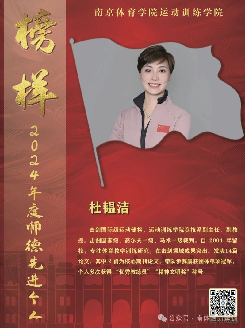 扎根教学一线22载,杜韫洁副教授以其深厚的学术造诣和丰富的教学经验,引领运动训练学院重竞技系击剑专项蓬勃发展。作为硕士研究生导师和国家级击剑裁判员,她不仅承担着击剑专项教学任务,还负责系内的教学管理、科研管理、学生毕业论文指导及专业实习组织等工作。在她的带领下,击剑专项队伍从最初的2人壮大至120余人,培养了大批优秀的体育人才,她始终秉持着“剑锋所指,心之所向;磨砺剑艺,育人为本”的格言,为江苏省乃至全国的体育事业做出了突出贡献。