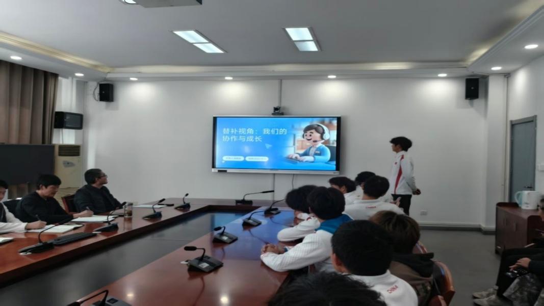 在交流环节,来自球队不同位置的同学(徐苏徽、包子旭、徐乾程、杨嘉俊)——包括场上主力、后勤队员、替补球员与得分功臣一一分享了参赛感悟。主力队员坦言高压下的团队协作是关键;后勤同学从另一视角见证了球队成长,体会到奉献精神的可贵;替补球员则珍惜每一次临危受命的机会,深刻理解了“时刻准备着”的含义;进球队员将关键得分归功于全队的默契配合。这些多元视角共同勾勒出一支年轻球队在压力下坚守、在奉献中成长、在突破中前行的生动图景,令与会者重温了那段激情洋溢的赛场岁月。