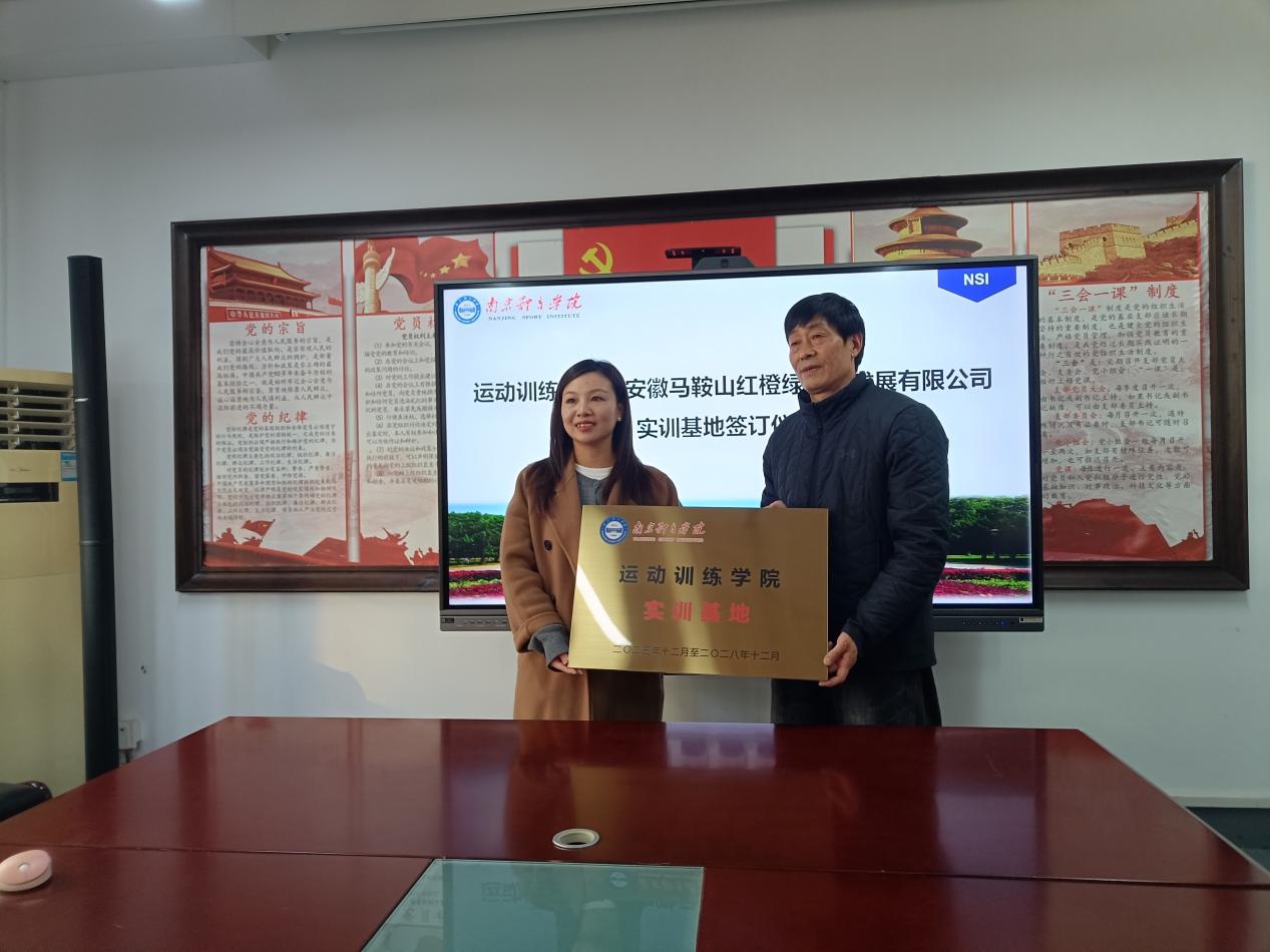 在与会人员的共同见证下,赵琦院长与奚旸董事代表双方共同签署了《实训基地合作协议》。随后,赵琦院长向安徽马鞍山红橙绿体育发展有限公司授予“南京体育学院运动训练学院实训基地”铜牌,并合影留念。