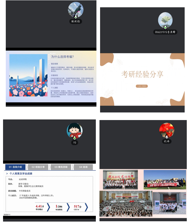 活动邀请四位深耕不同赛道的嘉宾倾情分享:考编领域的往届学姐张欣怡以“职业价值与选择逻辑”为切入点,解析编制工作的稳定保障与发展空间,点出“盲目跟风报考”“忽视岗位适配性”等常见误区,围绕面试类型界定、高频题型攻坚、模拟练习强化、素材积累沉淀等核心环节,提供全流程备考策略;考研领域的往届学长李奕锋聚焦备考全周期管理,从目标院校精准定位、公共课与专业课复习节奏把控,到备考心态动态调节,系统拆解考研核心要点;推免领域的应届学姐方赛雅结合自身经历,详解推免前期准备、申请材料打磨、目标院校联系等关键流程,助力有推免意向的同学提前布局、精准发力;西部计划领域的往届学长纪伟分享了投身基层服务的初心使命与实践收获,全面介绍项目政策、服务内容及成长价值,鼓励同学们以青春之力扎根基层、奉献社会。