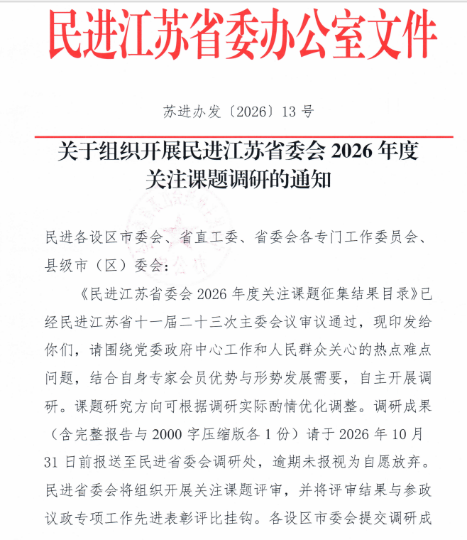 近日,民进江苏省委会印发《关于组织开展2026年度关注课题调研的通知》,正式发布年度关注课题征集结果目录,围绕党委政府中心工作及社会热点难点问题,组织全省各级组织和专家会员深入开展调查研究。