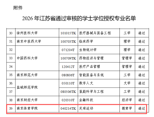 近日,江苏省教育厅发布《2026年江苏省学士学位授权专业审核结果公示》,南京体育学院运动训练学院(足球学院)申报的足球运动专业(专业代码:040214TK)顺利通过审核,获批学士学位授予资格。
