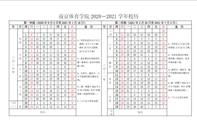 南京体育学院2020-2021学年校历