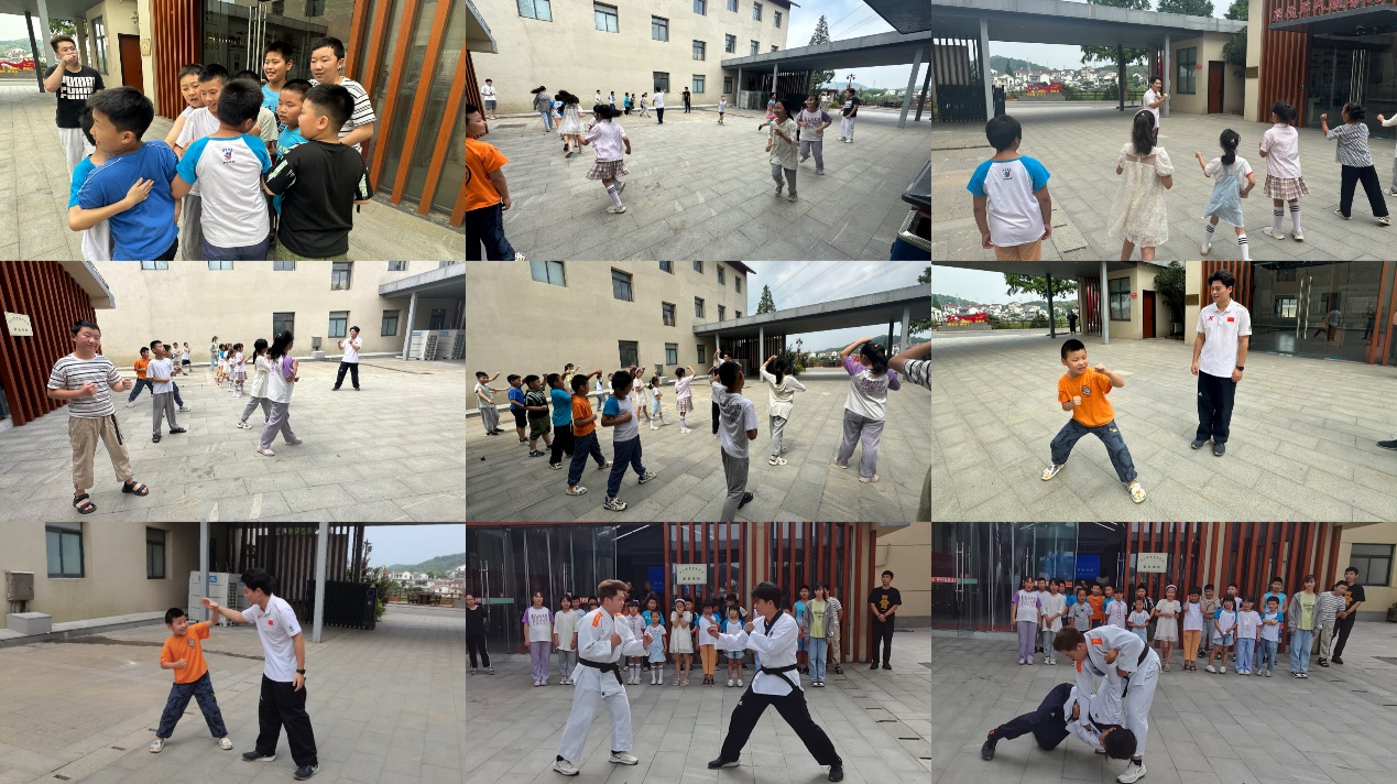 活动伊始,同学们为社区儿童表演跆拳道、柔道等技能展示,在严超飞、周俊宇等四名同学的带领下,开展跑步热身活动、游戏互动、格斗式防守等动作教学,在同学们的口令声中完成一次次动作转换,喊出整齐响亮的“嘿哈”声,他们不喊累、不叫苦完成训练课,他们天真活泼、朝气蓬勃,脸上洋溢着幸福的笑容,感受体育带来的快乐。