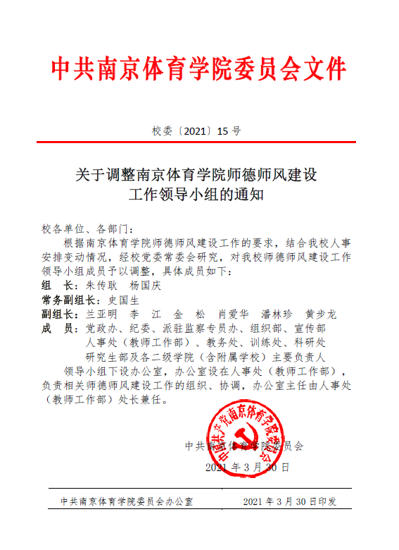 关于调整南京体育学院师德师风建设工作领导小组的通知