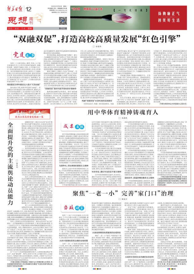 10月28日,《新华日报》第12版(思想周刊)刊发了马克思主义学院副教授朱晓林的署名文章《用中华体育精神铸魂育人》。文章内容全文如下: