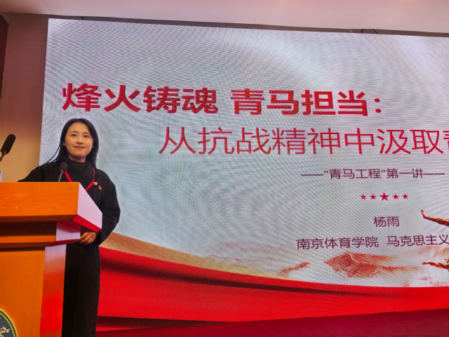 为深入学习贯彻党的二十届四中全会精神,扎实推进“青马工程”为党育人的战略任务,12月10日下午,南京体育学院第十一期“青马工程”培训班结营仪式暨第十二期开班仪式在图书馆第一报告厅举行。马克思主义学院杨雨老师应邀为第十二期“青马工程”培训班学员讲授开班第一课。课程以“烽火铸魂 青马担当——从抗战精神中汲取青春奋进力量”为主题,通过深入的历史解读与生动的时代联结,引导“青马工程”培训班学员夯实信仰根基、明确使命担当。