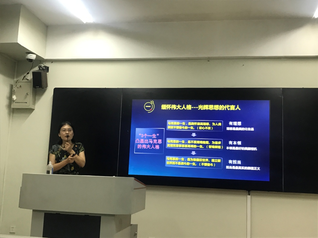 刘静老师从“为什么要纪念和致敬马克思”、“传承和信仰什么样的马克思主义”、“怎么样学习和实践马克思主义”三个方面展开论述,阐述了马克思这位“千年第一思想家“,他有理想、有本领、有担当的一生。她还从“三个飞跃“论证了伟大运动在中国创造的奇迹,”四个理论“概括了马克思主义鲜明特征。马克思主义始终是我们党和国家的指导思想,是我们认识世界、把握规律、追求真理、改造世界的强大思想武器。