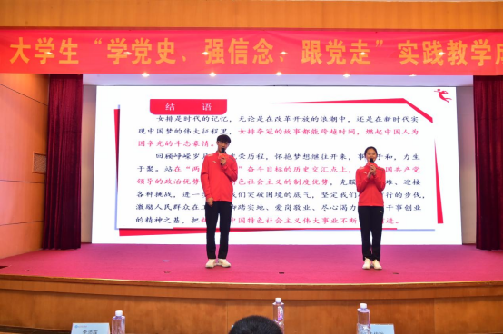 最后,校党委书记朱传耿发表讲话,他表示恰逢建党一百周年,在全党开展党史学习教育之际,马克思主义学院结合自身工作业务特点与党史学习教育需要,将思政课实践教学与党史学习教育巧妙融合,组织全校大学生开展以“学党史、强信念、跟党走”为主题的思政课实践教学展示活动,对于引导广大学生学史明理、学史增信、学史崇德、学史力行,从党史的学习中汲取思想的力量、信仰的力量、道德的力量和实践的力量有着重要意义。本次活动充分调动了我校青年大学生学党史的积极性,创作出一批高质量的情景剧、微视频和党史故事作品,使得我校党史学习教育形成师生同频共振的双主体格局,营造了比学赶超、开拓奋进的浓厚党史学习氛围。