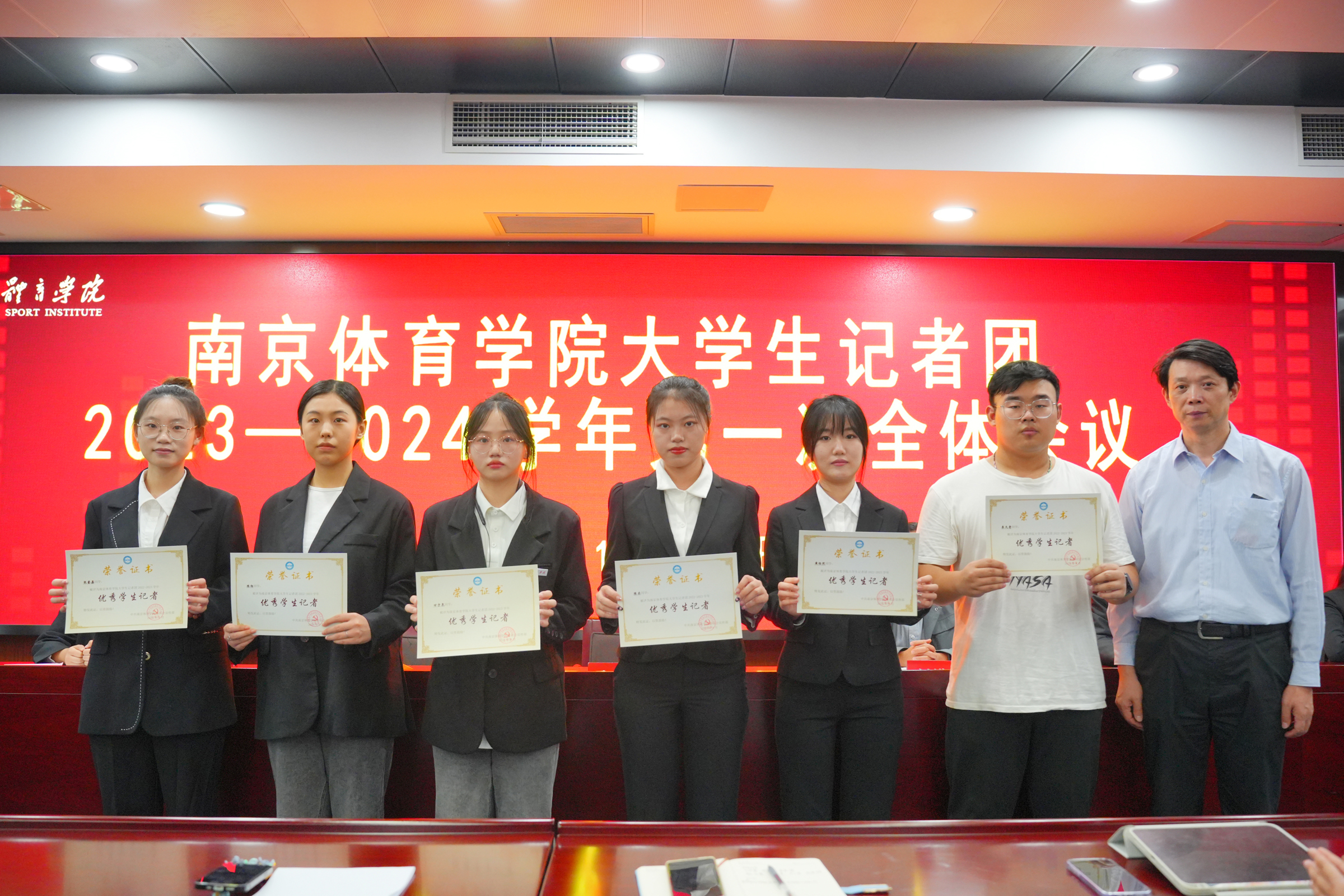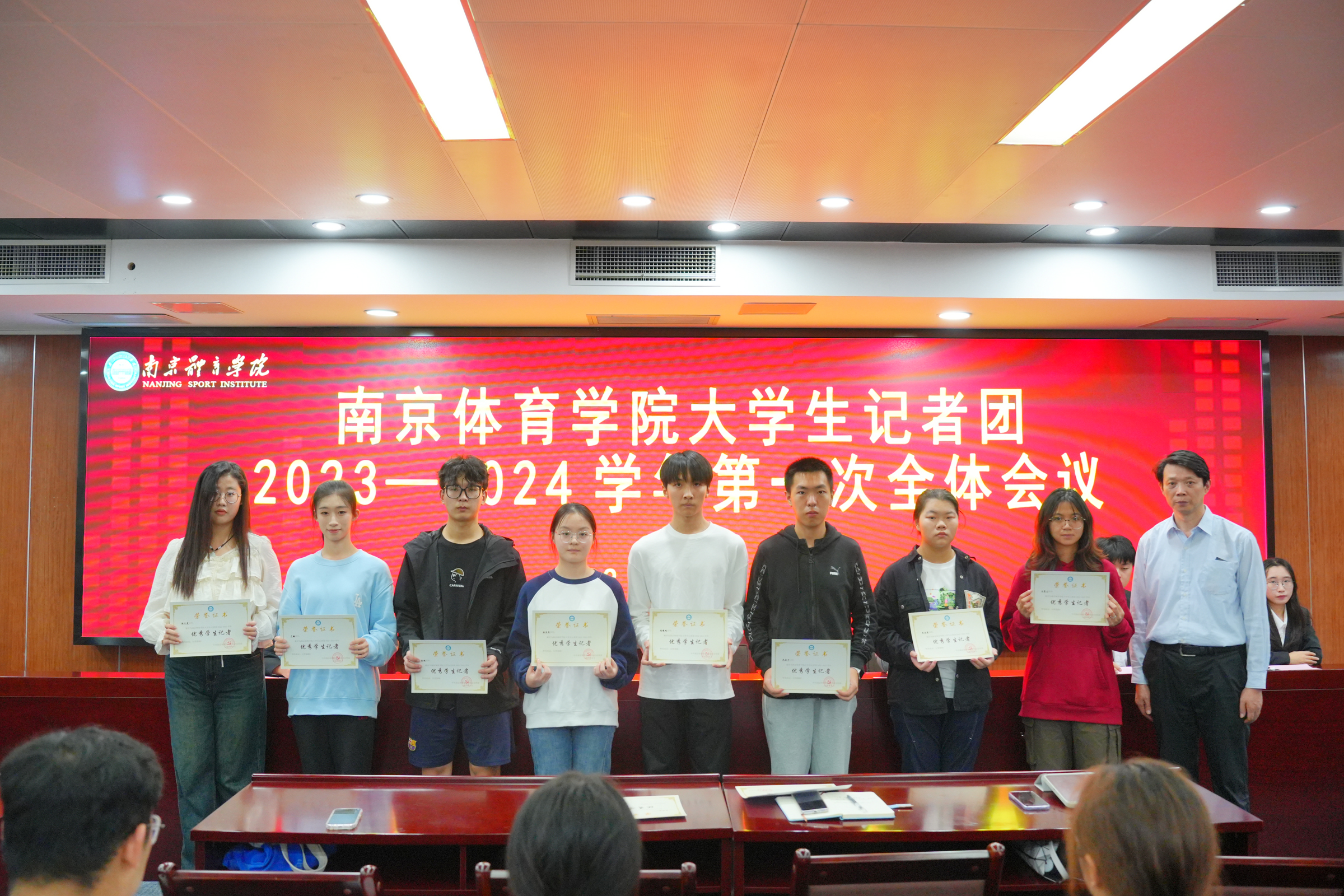 在会议第一阶段,许立俊为校大学生记者团新一届主席团成员颁发聘书,为2022年南京体育学院新闻宣传工作先进个人许骥如、卢秋佚、崔馨睿和2022-2023学年校大学生记者团优秀学生记者颁发荣誉证书。