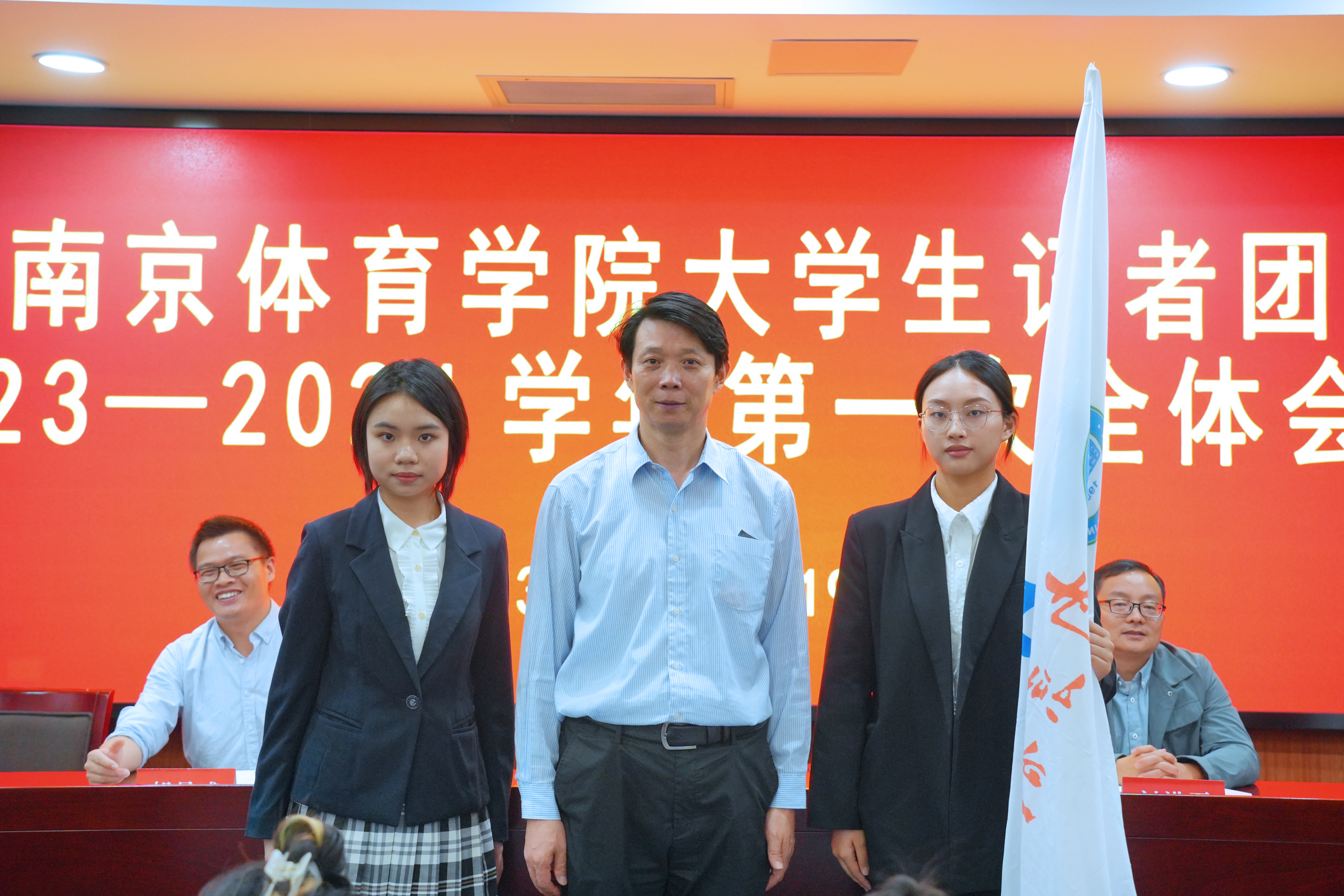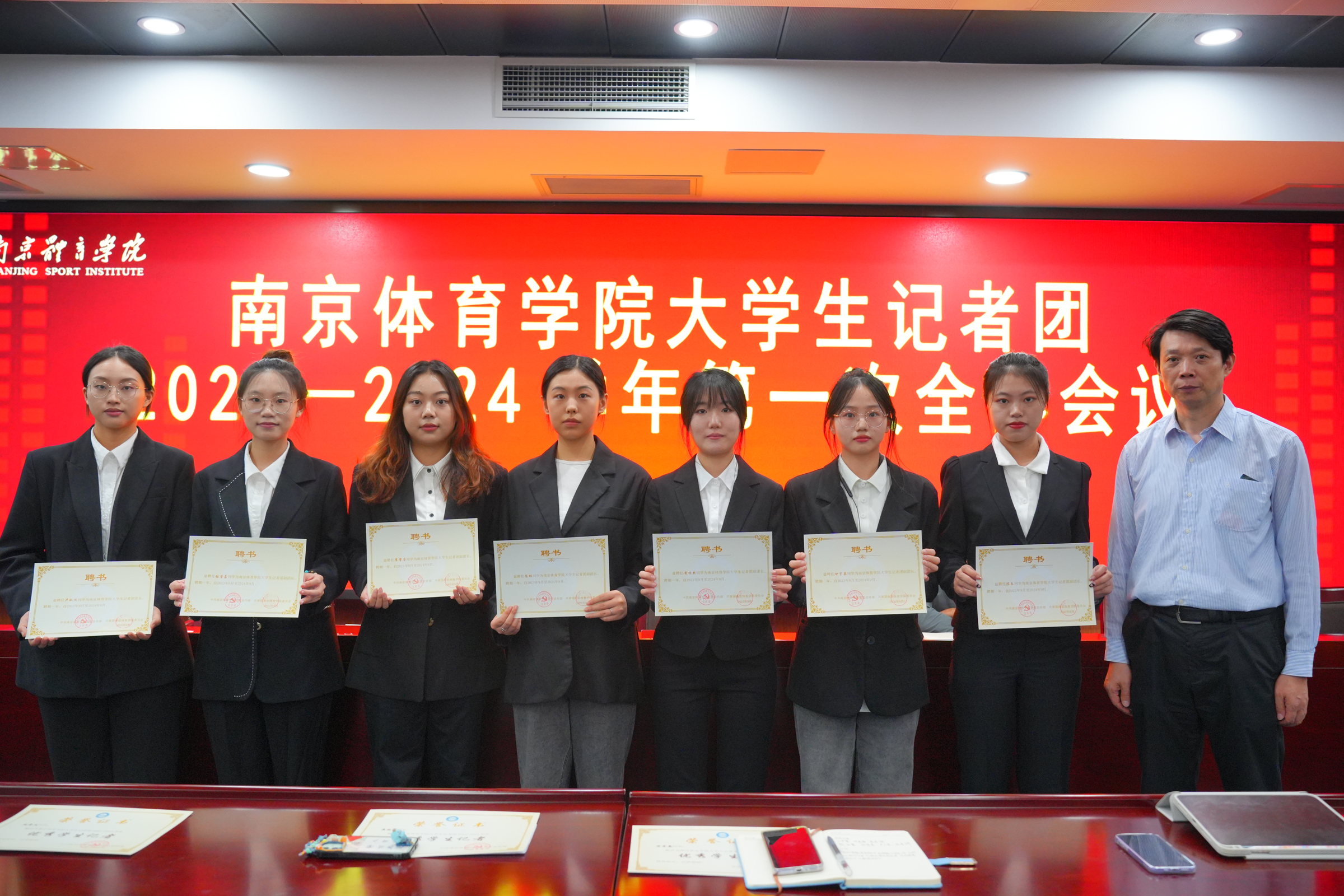 刘洪磊宣读了《中共南京体育学院委员会宣传部、共青团南京体育学院委员会关于2023-2024学年大学生记者团主席团的聘任决定》。卢秋佚担任记者团团长(第8任),张睿嘉、崔馨睿、陈杨、黄怡然、甘宇泉、陈乐担任记者团副团长。