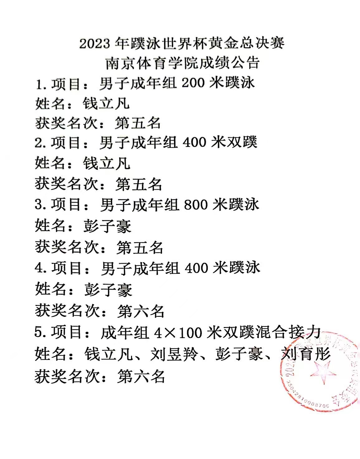 10月18日—20日,2023年蹼泳世界杯黄金总决赛在三明市将乐体育中心举行。此次赛事是2023年度蹼泳世界杯的收官之战,也是蹼泳项目年度最高水平的赛事之一。南京体育学院运动训练学院游泳专项4名学生代表南体首次参赛并交出了一份满意的答卷。