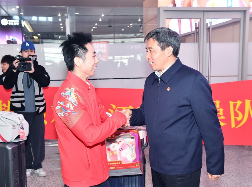 校党委书记刘红明与运动员握手欢迎他们载誉归来