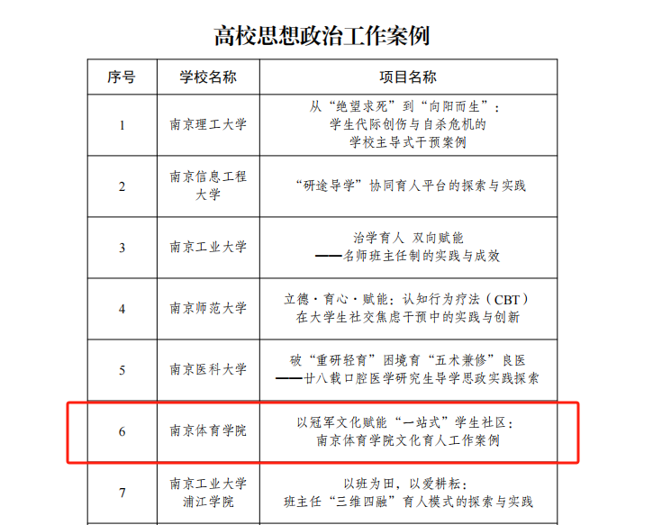 4月8日,省教育厅印发通知公布了第四批江苏高校思想政治工作质量提升工程建设项目遴选结果。我校申报的高校思想政治工作案例《以冠军文化赋能“一站式”学生社区:南京体育学院文化育人工作案例》入选江苏省高校思想政治工作案例立项名单。该项目由党委常委、副校长鲍勤担任负责人,党委常委、党委宣传部部长、党委统战部部长、学工处处长丁永亮,学工处副处长杨蓉以及魏晓民、侯俊如、丁芮担任项目组成员。