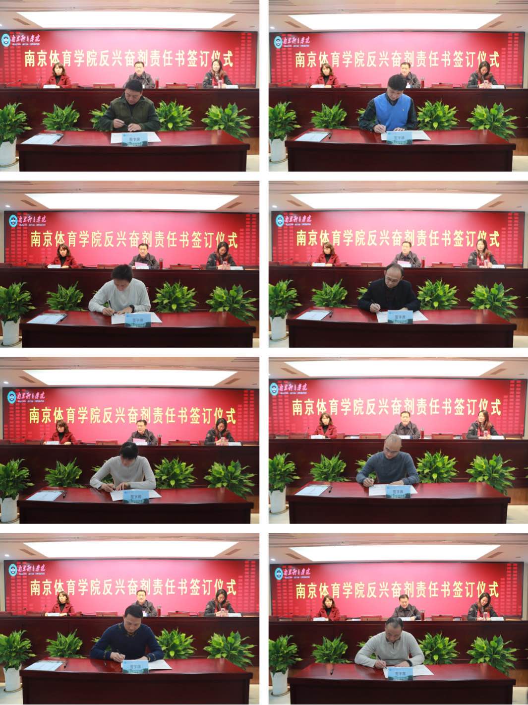 各竞技体育二级学院负责人、运动康复医院负责人、竞技体育研究院负责人、后勤处负责人分别签订《南京体育学院第三十二届奥运会和第十四届全运会反兴奋剂工作责任书》