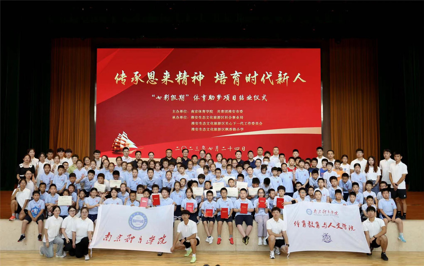 7月24日下午,体育教育与人文学院“传承恩来精神 培育时代新人”2023年“七彩假期 体育助梦”志愿服务项目结业仪式在淮安市枫香路小学举行。淮安市体育局局长祁德霞,共青团淮安市委副书记刘浏,南京体育学院党委常委、党委组织部部长陆玉林,南京体育学院团委副书记(主持工作)、2008年北京奥运会蹦床冠军陆春龙,南京体育学院体育教育与人文学院党总支副书记喻菊,南京体育学院团委副书记、2010年技巧世界冠军赵玉超,骏博体育发展(江苏)有限公司董事长、南京市青联委员、玄武区青联副主席张淼,淮安生态文化旅游区社会事业局副局长姜兵等领导和嘉宾出席仪式。枫香路小学有关负责同志,“体育助梦”团全体师生及参与本次活动的枫香路小学学生共同参加了仪式。
