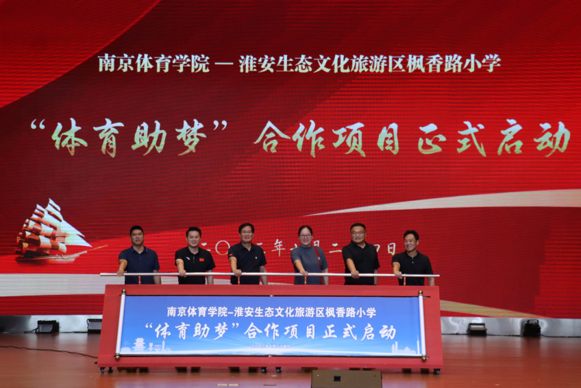 现场还举行了南京体育学院大学生社会实践基地挂牌仪式、南京体育学院——淮安生态文化旅游区枫香路小学共建合作启动仪式。陆春龙代表南京体育学院为枫香路小学授牌;陆玉林、祁德霞、陆春龙、刘浏、姜兵、董锐共同按下按钮,宣布南京体育学院——淮安生态文化旅游区枫香路小学“体育助梦”合作项目正式启动。