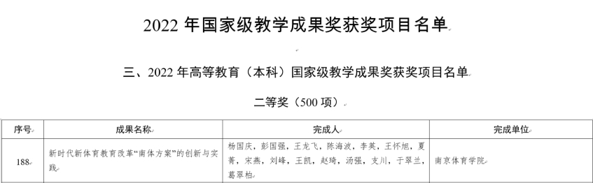 近日,教育部公布了2022年国家级教学成果奖获奖项目名单,校党委副书记、校长杨国庆主持的《新时代新体育教育改革“南体方案”的创新与实践》荣获高等教育(本科)国家级教学成果奖二等奖。